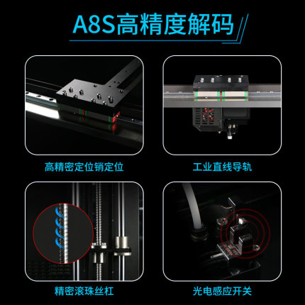 對于打印精度以及打印效果穩定、機器運行穩定的雙穩定上,A8S投入了十足的零件用料和技術投入。運動組件、擠出組件、控制組件,在三大功能組件上都遵循了嚴格的質量控制。
