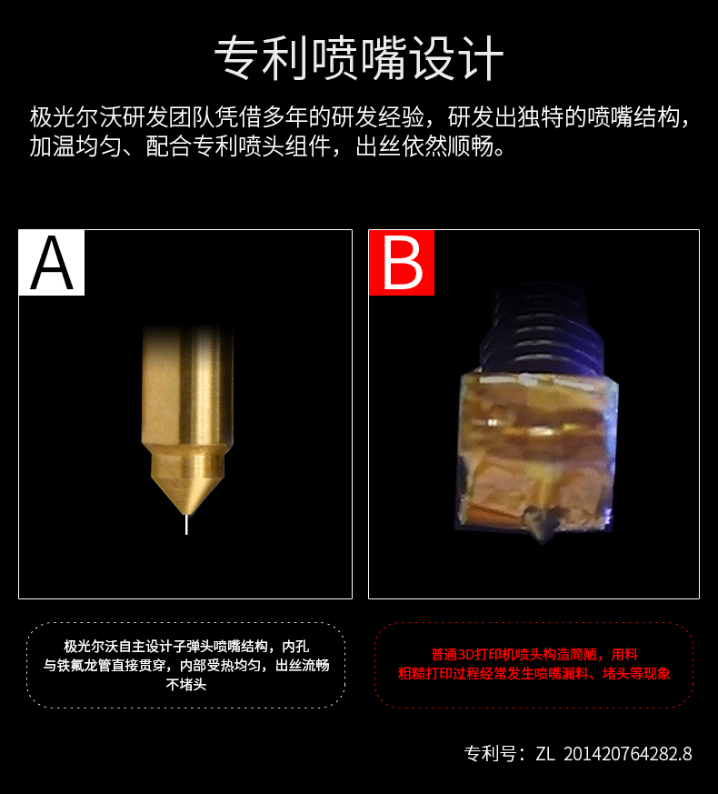 A8S使用了研發的專利噴頭,出絲更順暢,特殊的內部構型降低了堵頭風險,提高了30%以上的使用壽命。CNC加工一體成型的打印平臺,平整度更高,能夠有效提高噴頭的準確定位。雙擠出機同步擠出,能夠保證擠出順暢,同時也降低了單擠出機容易出現的斷料風險,對于中途更換材料也有極高的便利性。