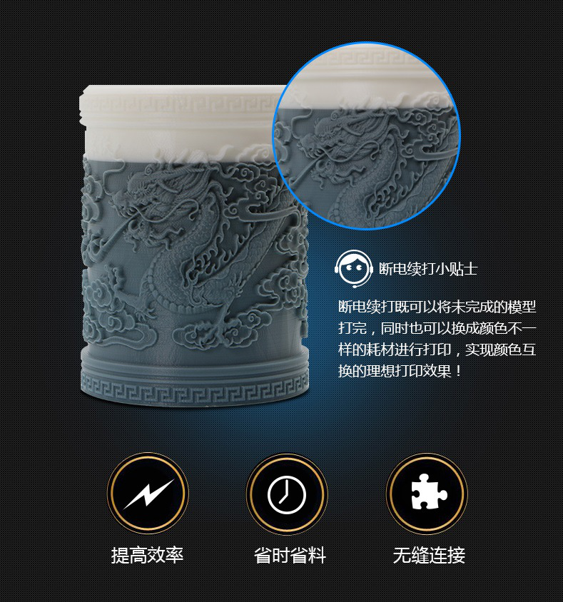 全金屬機身及框架是打印運動穩定的基石,高精度定位銷定位+工業級直線導軌+雙滑塊直線導軌技術,多重保障能夠能夠大大提高XY軸運動平穩性,Z軸使用了精密滾珠絲桿,效果數倍于普通的T型絲桿,有效保證了平臺升降的穩定性及定位精度。三軸運動進程出錯 率≤98%,運動精準才能保證打印精確。